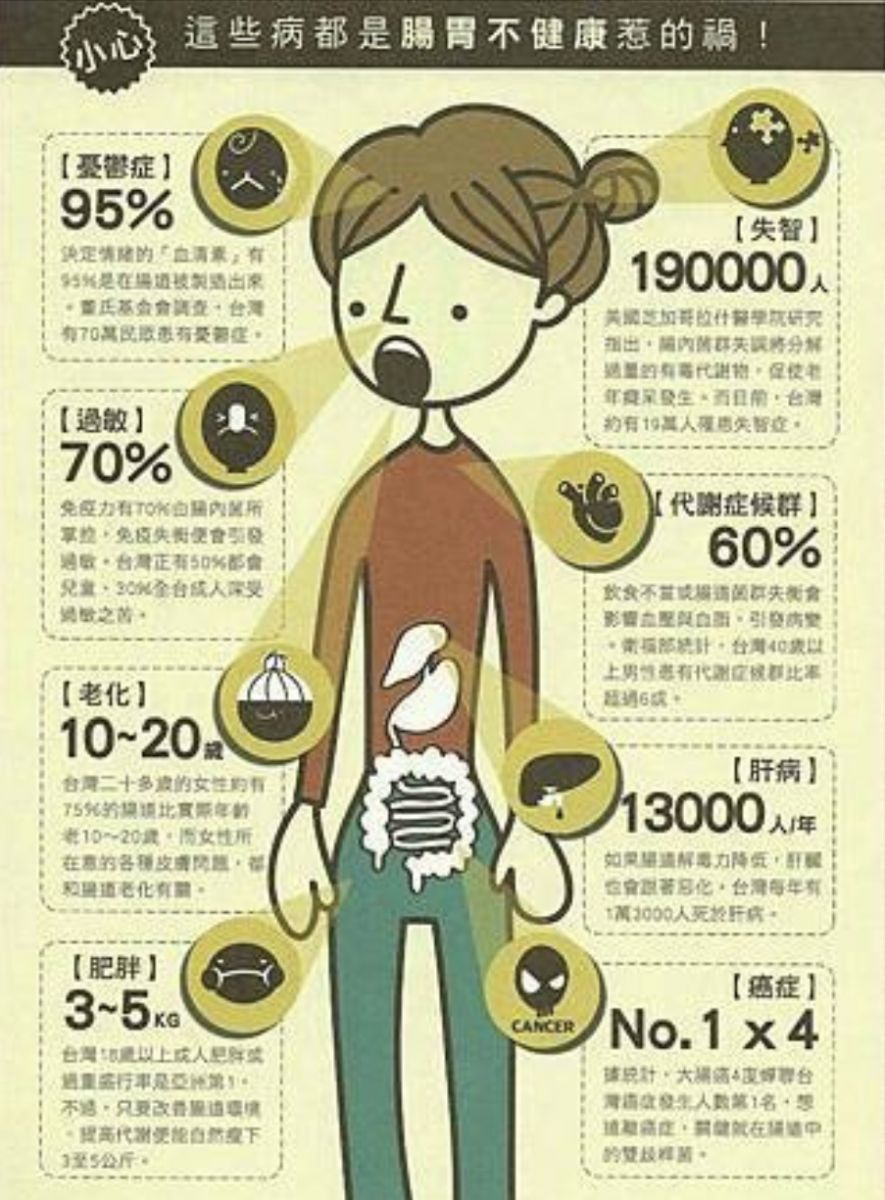 以最常見的腸道問題便秘為例,身體的廢物持續在腸道中腐敗,產生的毒素便會重新被腸道吸收,長久累積之下將導致各種病變。蔡英傑也指出,腸道不僅是消化器官,更是人體最強大的免疫器官、第二大腦,現在更有許多研究發現,諸多疾病如肝癌、心臟病、高血壓、動脈硬化、糖尿病、失智症等,甚至憂鬱症、慢性疲勞等神經心理疾病,都與腸道有密切關聯。